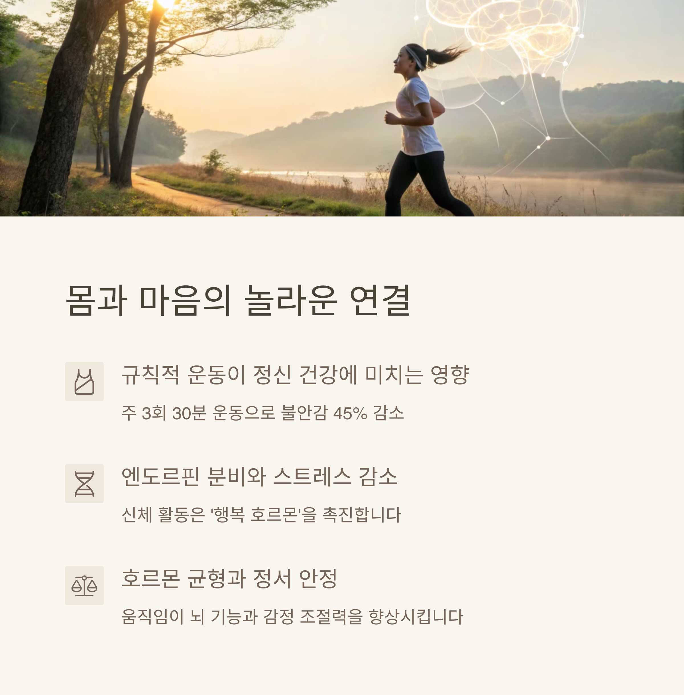 과학적으로도 입증됐습니다. 운동은 우울감 완화, 불안 감소, 집중력 향상에 효과적이에요.