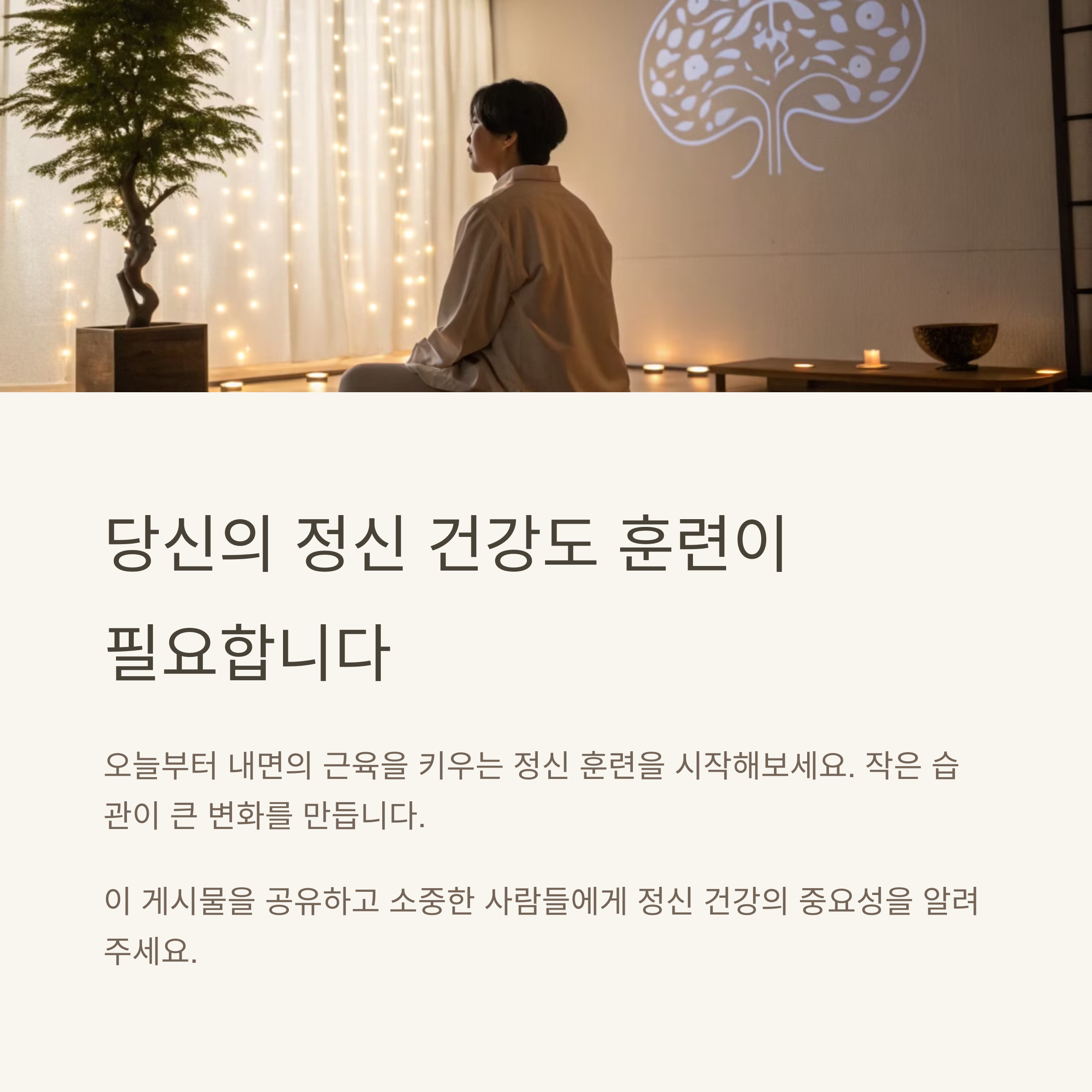 오늘도 내 마음을 위해 뭐 하나 해보셨나요? 정신 건강은 어느 날 갑자기 무너지는 게 아니라, 매일 조금씩 방치한 결과일지도 몰라요. 이제부터라도 ‘정신도 훈련이 필요하다’는 걸 기억해 주세요. 나만의 리듬으로, 작은 루틴 하나부터 시작해보면 분명 변화가 느껴질 거예요. 댓글로 여러분만의 마인드 훈련 팁도 공유해 주세요. 우리 함께, 더 튼튼한 마음을 만들어봐요!