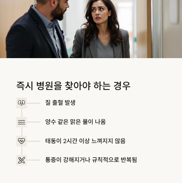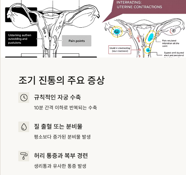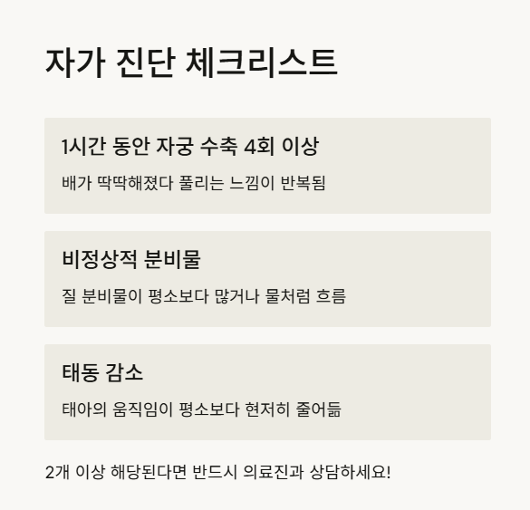 2개 이상 해당된다면 반드시 의료진과 상담해야 합니다. 자가 진단은 조기 진통의 경고음을 듣는 데 도움이 되지만, 의사의 판단을 대체할 수는 없습니다.