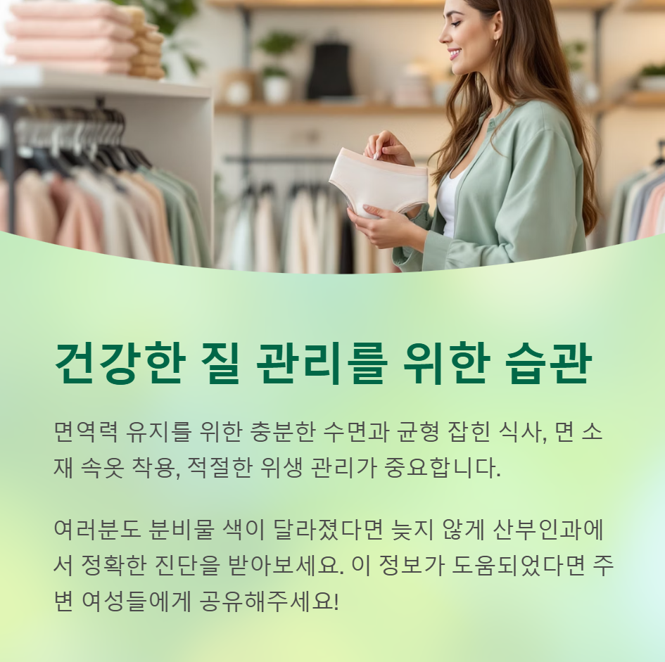 • 위생 관리: 생리 중 자주 속옷 교체, 성관계 전후 청결 유지가 필요합니다.