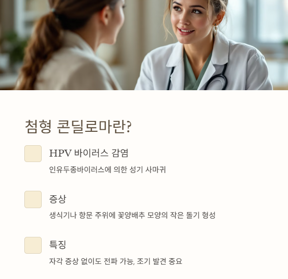 첨형 콘딜로마는 인유두종바이러스(HPV)에 의해 발생하는 성기 사마귀로, 주로 생식기나 항문 주위 피부에 작은 돌기 형태로 나타납니다. 이 질환은 성 접촉을 통해 감염되는 대표적인 성병 중 하나로, 남녀 모두에게 발병할 수 있습니다. 사마귀는 꽃양배추처럼 퍼지는 모양을 하고 있으며, 간지러움이나 통증을 유발하기도 합니다. 일부는 자각 증상이 없어 자신도 모르게 전염원이 되기도 하므로 조기 발견과 치료가 중요합니다【대한산부인과학회】.