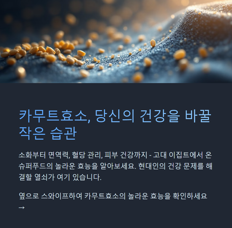 여러분은 평소 소화 건강이나 면역력에 대해 고민해보신 적 있으신가요? 혹시 만성 피로나 피부 트러블로 고생하고 계시다면, 일상 속 작은 변화인 '카무트효소 섭취'를 시작해보세요. 여러분의 이야기도 댓글로 공유해 주세요!