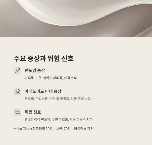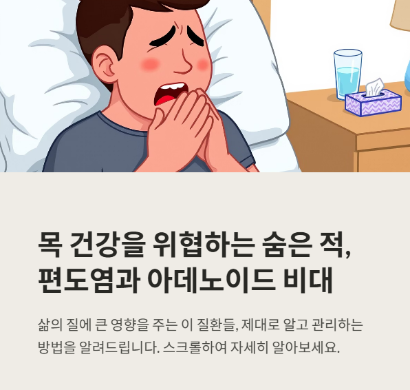 편도염과 아데노이드 비대는 단순한 질병이 아니라 삶의 질에 큰 영향을 주는 질환입니다. 평소 면역력 관리를 통해 감염을 예방하고, 증상이 반복될 경우 적극적인 치료를 받는 것이 중요합니다. 무엇보다 건강한 생활 습관이 최고의 예방책입니다. 오늘부터 가족의 목 건강을 지키는 작은 습관, 하나씩 실천해보세요!