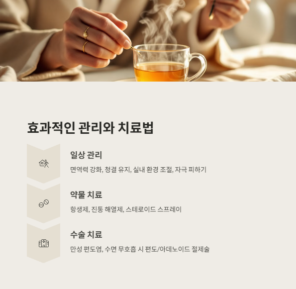 - 약물 치료: 항생제(세균 감염 시), 진통 해열제, 스테로이드 스프레이