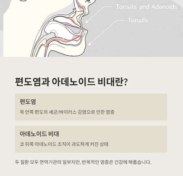 편도염은 목 안쪽의 편도가 세균이나 바이러스에 감염되어 염증이 생기는 질환이며, 아데노이드 비대는 코 뒤쪽에 위치한 아데노이드 조직이 과도하게 커진 상태를 말합니다. 이 두 질환은 주로 어린이에게 흔하지만, 성인에게도 발생할 수 있습니다.