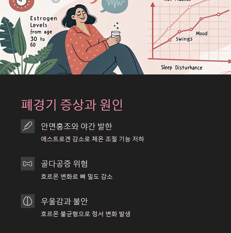 폐경기 증상은 주로 에스트로겐 수치 감소로 인해 발생합니다. 이 호르몬은 여성의 생식뿐 아니라 뼈 건강, 심혈관 기능, 기분 조절 등 다양한 신체 기능에 관여하죠. 호르몬 불균형이 생기면 다음과 같은 증상이 나타납니다: