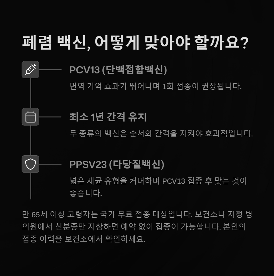 | PPSV23 (다당질백신) | 넓은 세균 유형 커버 | PCV13 접종 후 최소 1년 뒤 접종 |
