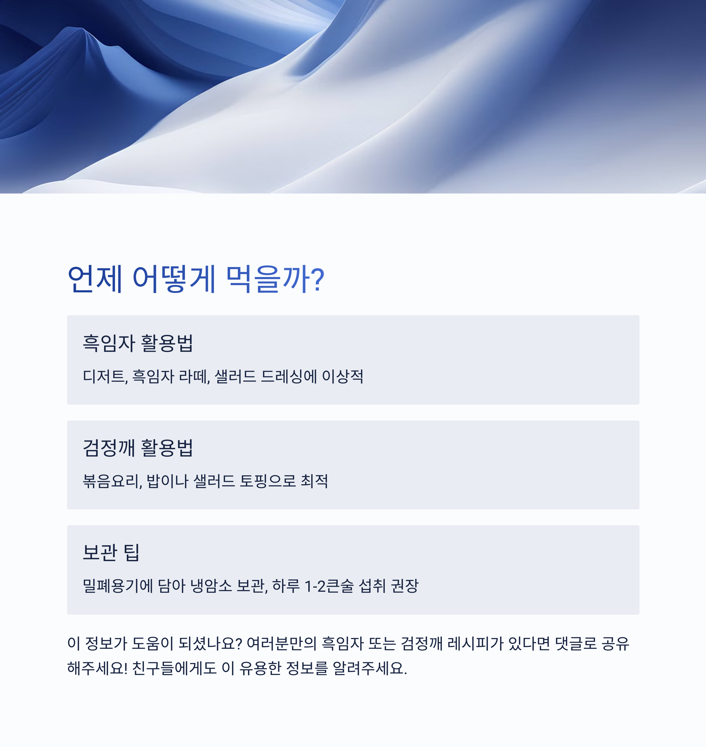 오늘 포스팅이 흑임자와 검정깨에 대한 궁금증을 조금이라도 풀어드렸다면 정말 기쁩니다. 사실 저도 처음엔 그냥 같은 건 줄 알았는데요, 알고 보니 다르고 또 각자의 매력이 있어서 요즘은 상황에 맞게 골라서 잘 먹고 있어요. 여러분도 이제 메뉴 고를 때나 장 볼 때 ‘어, 이건 이래서 좋고 저건 저래서 좋구나~’ 하면서 똑똑하게 선택하실 수 있겠죠? 건강도 챙기고 입맛도 챙기는 알짜 정보, 앞으로도 계속 공유할게요. 댓글로 여러분의 꿀팁도 알려주세요 :)