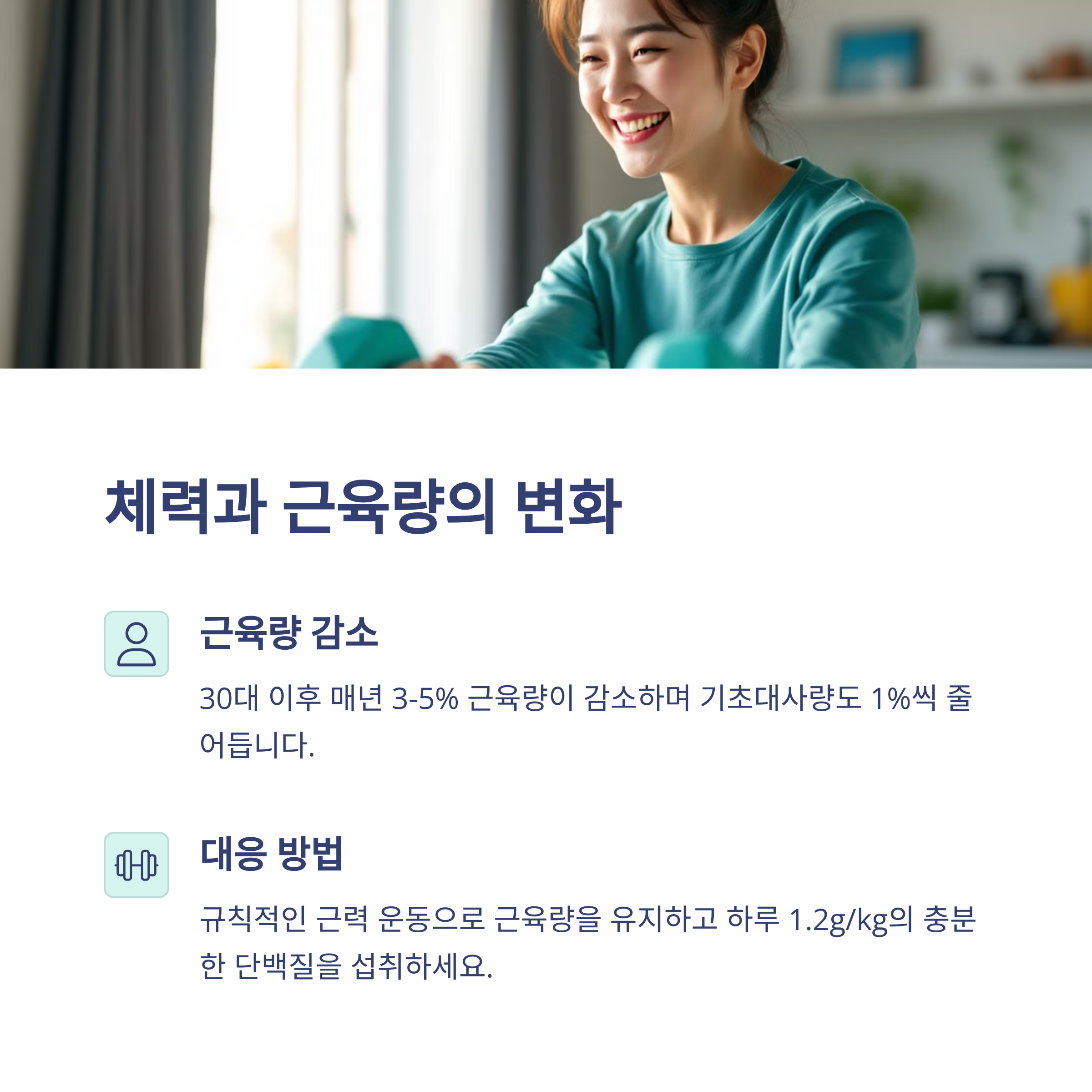 40대 이후, 특히 남녀 모두에게 가장 먼저 체감되는 변화는 바로 근육량 감소입니다. 어렸을 때처럼 조금만 운동해도 근육이 붙지 않고, 체중은 그대로인데 몸이 퍼지는 느낌을 받는다면 그게 바로 대사율 저하의 신호일 수 있어요. 실제로 30대 후반부터 해마다 1% 정도 근육이 줄어들 수 있다고 하니, 의식적으로 근육을 유지하는 활동이 필수죠.
