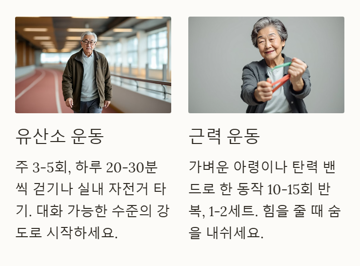 운동 조합: 호흡 운동, 유산소 운동, 근력 운동을 균형 있게 병행하세요.